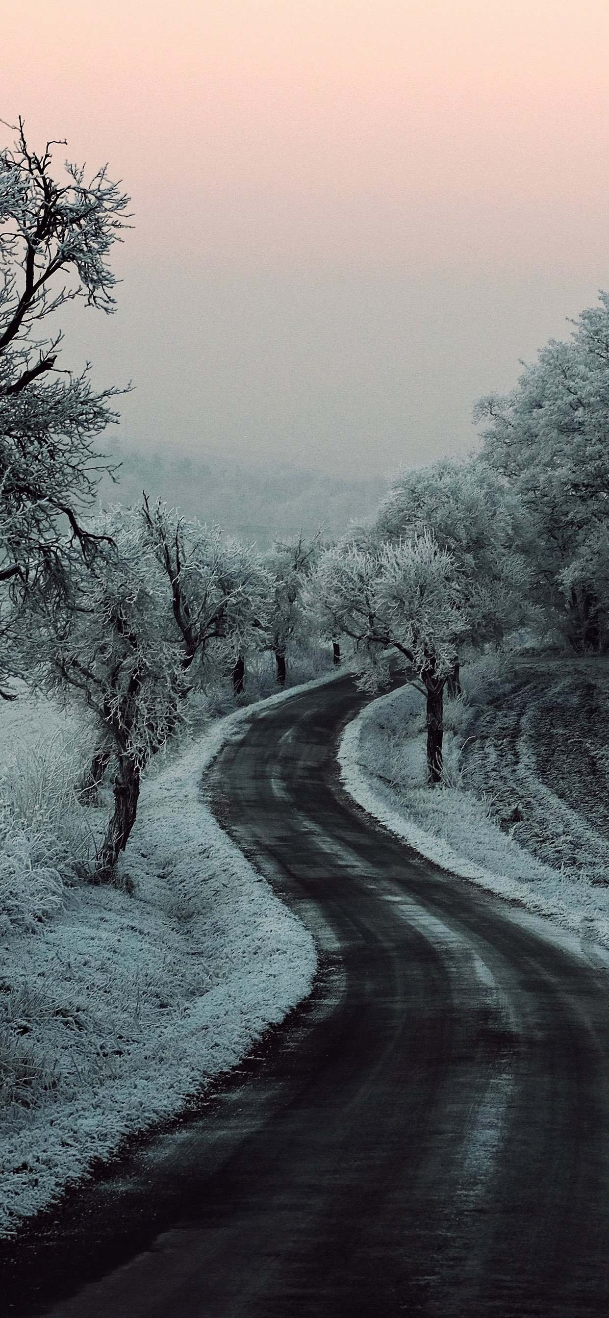 Ecco uno sfondo dedicato proprio al periodo invernale con tanta neve ed una strada che rappresenta il viaggio tra la natura e tra gli alberi di una foresta, verso un nuovo anno, o meglio un nuovo inizio.